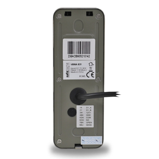 Vstupná kamerová jednotka VERIA 831 je vybavená 2 výstupnými reléovými NO alebo NC (podľa nastavenia) výstupmi. Jeden výstup ovláda dverný elektrický zámok a druhý slúži na ovládanie zariadenia bez prúdovej záťaže, napríklad pojazdu elektrickej brány.