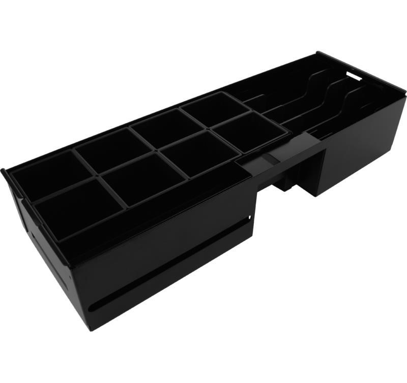 - Vy´jmateľný kovový zásobník na bankovky s plastovými oddelovačmi prihrádok