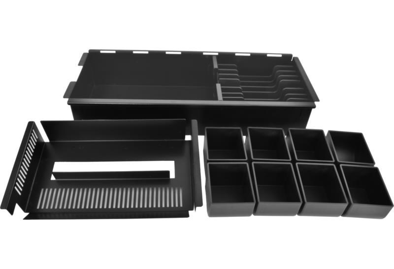 - Vyberateľný kovový priečinok s nastaviteľnými plastovými deličmi priehradiek pre bankovky