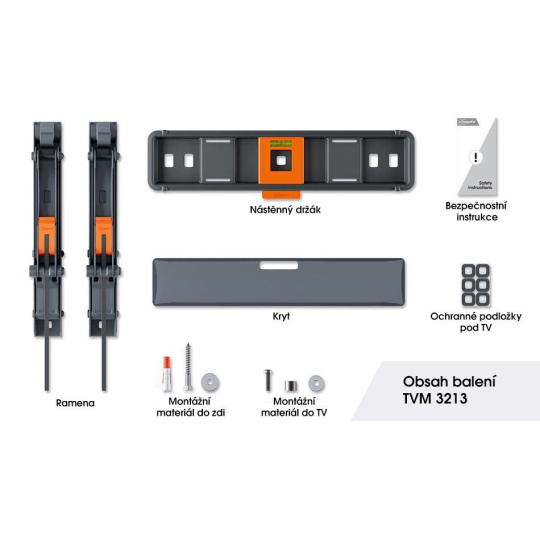 Držiak TVM 3213 je vybavený jedinečným bezpečnostným systémom ClickLoc™. Tento systém umožňuje jednoduché zamknutie alebo uvoľnenie televízora z nástenného držiaka. Vďaka počuteľnému zaklapnutiu máte istotu, že je televízor bezpečne zajištený na svojom mieste. Mäkké podložky medzi držiakom a TV chránia zadnú stranu televízora počas jeho montáže pred poškrabaním.