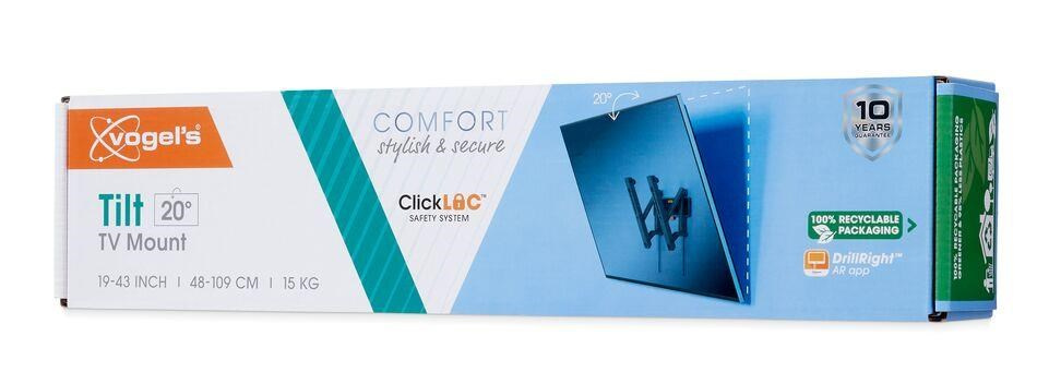 S násteným držiakom TVM 3213 rady COMFORT Tilt volíte štýl, bezpečnosť a príjemný zážitok zo sledovania. Nástenný držiak je ideálny pre prípady, keď je televízor umiestnený na stene o niečo vyššie, napríklad v spálni. Môžete ho nakloniť až o 20° a vytvoriť tak ideálny pozorovací uhol. Nástenný držiak je vhodný pre televízory s uhlopriečkou od 19 do 43 palcov a hmotnosťou do 15 kg. Televízor si naozaj užijete, až keď si ste istí, že je pekne a bezpečne namontovaný. Štýlový držiak TVM 3213 vám túto istotu poskytne. Nástenný držiak je navrhnutý a vyrobený na dlhodobé intenzívne používanie.