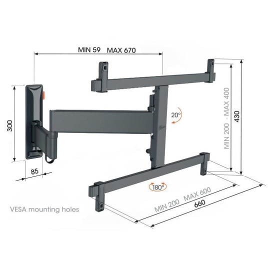 - Otočte televízor až o 180° vďaka 67 cm dlhým ramenám
