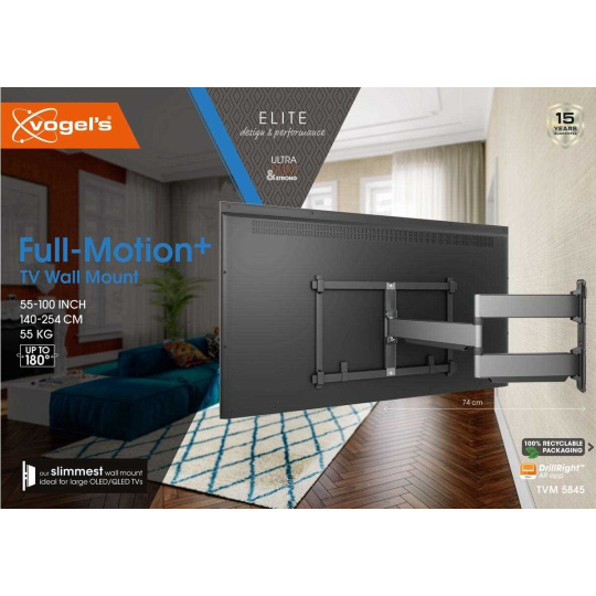 Nástenný držiak ELITE Forward Motion TV je špeciálny, mimoriadne pevný nástenný držiak vhodný pre televízory s uhlopriečkou 55 až 100 palcov a hmotnosťou až 75 kg - ideálny pre veľké OLED alebo QLED televízory. ELITE Forward Motion sa otáča až o 120°, takže môžete televízor sledovať prakticky z akéhokoľvek uhla. Držiak na stenu je nielen veľmi pevný, ale aj veľmi tenký, takže medzi televízorom a stenou ostáva len 4,5 cm.
