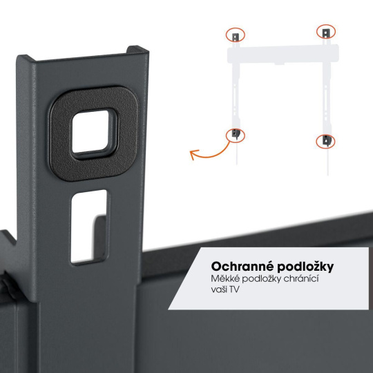Vďaka 69 cm dlhým ramenám má držiak veľký dosah dopredu, takže je ideálny na montáž do skrine alebo niky. Funkcia naklápania bola zámerne vynechaná kvôli ochrane veľkých citlivých obrazoviek. Výhodou veľkých obrazoviek je samozrejme to, že pre skvelý zážitok zo sledovania nie je nutné nakláňať.