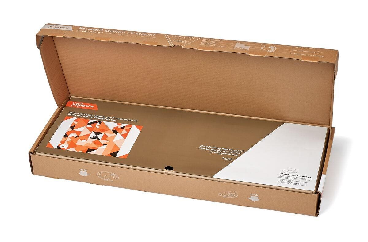 TV držiak DesignMount má dômyselný štyrramenný mechanizmus s dlhými a pevným nosnými ramenami. Vďaka tomu má veľký rozsah pohybu dopredu a umožňuje posunúť televízor až o 72 cm od steny. Ideálne pre montáž do skrinky alebo výklenku.