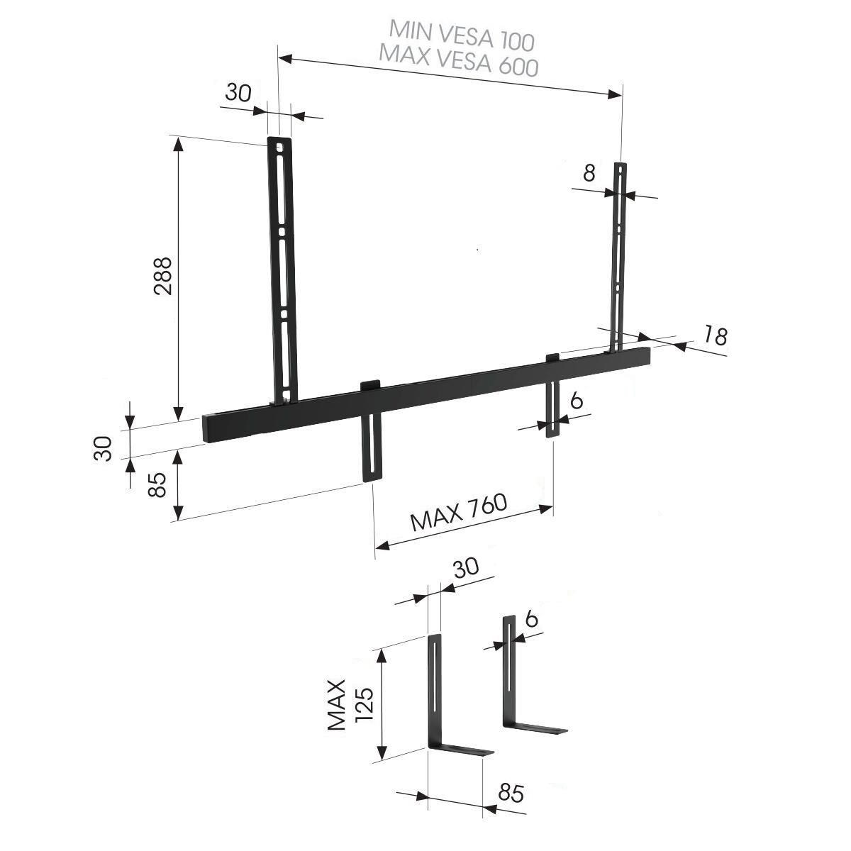SOUND 3550 sa ľahko prispôsobí na uchytenie soundbarov rôznych veľkostí a tvarov. Nezáleží, či majú otvory na uchytenie na zadnej alebo spodnej strane. Vyrobený je z kvalitnej ocele a hliníka s prémiovým povrchom.