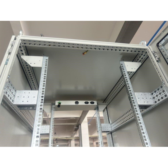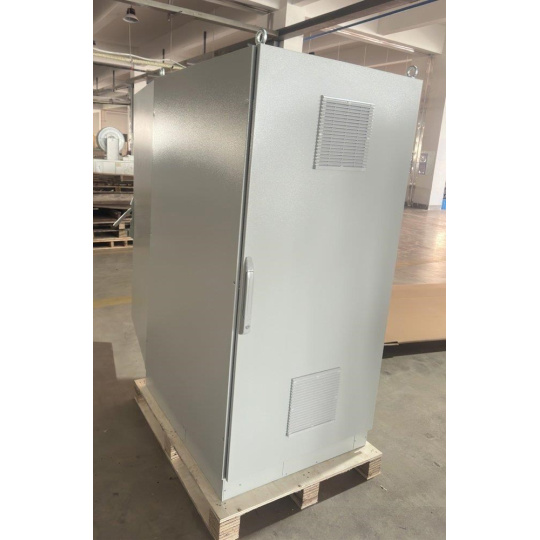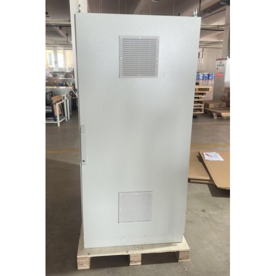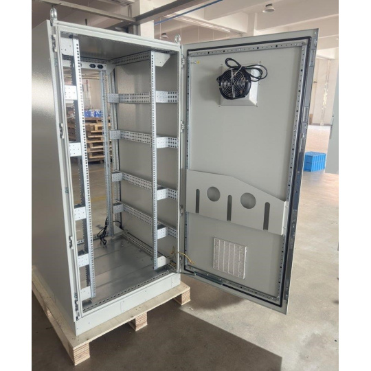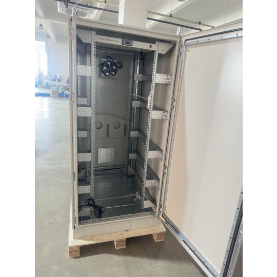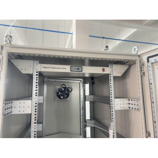 Rozvádzač pre inštaláciu dátových a telekomunikačných zariadení, ventiláciu s termostatom, podstavec, šedý.