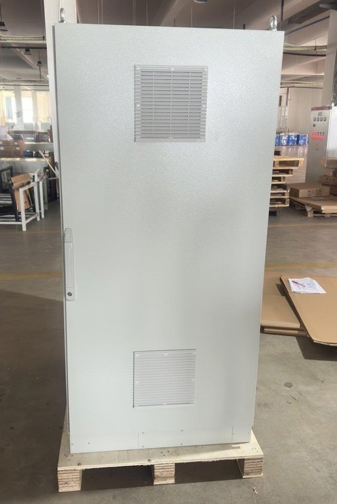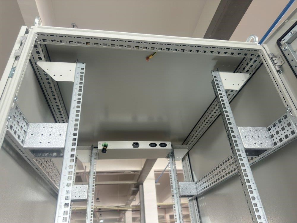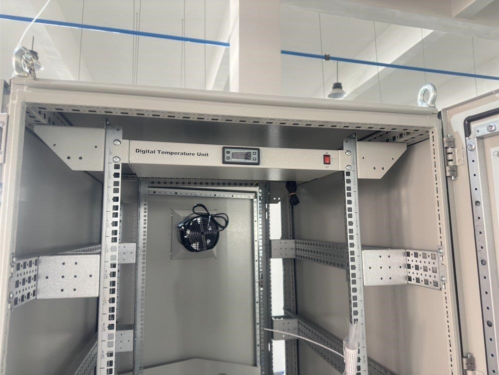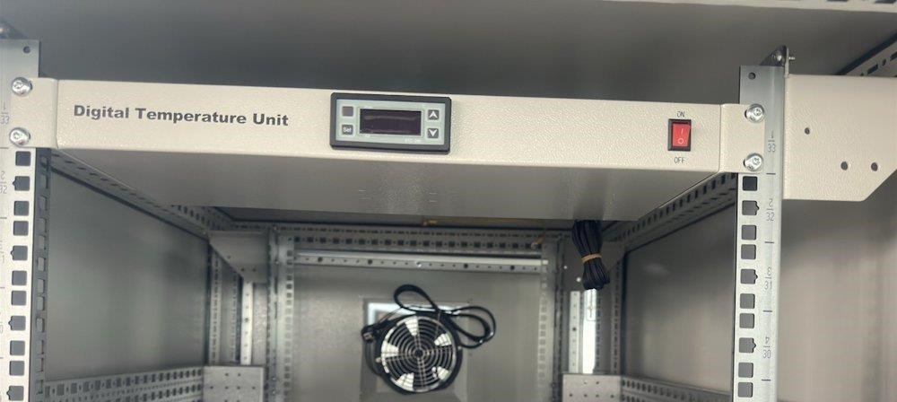 Rozvádzač na inštaláciu dátových a telekomunikačných zariadení, ventilácia s termostatom, podstavec, šedý.