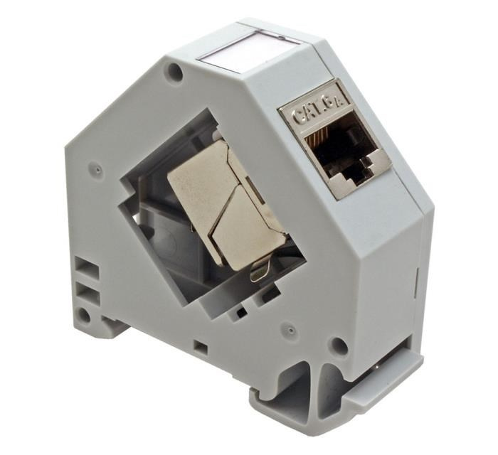 Plastový držiak na 1 lichobežníkový kameň na DIN lištu. Integrovaný kovový pásik zaisťuje uzemnenie lichobežníkového modulu.Štítok pre popis (odnímateľný po odstránení bočného krytu)..