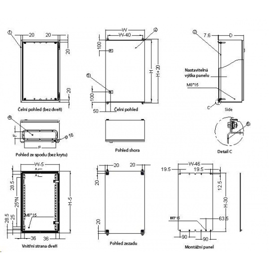 Rozvadeč je vyrobený z valcovanej ocele o hrúbke 1,5 mm. Štandardy: IEC60529, EN60529/10.91, GB4208-93  Vyhotovenie: dvere - plné, otvárateľné o 110 stupňov, montáž pravá alebo ľavá (používateľsky výmenné otváranie) základná krytina - plná bočný kryt - plný horný kryt - plný  montážna doska: