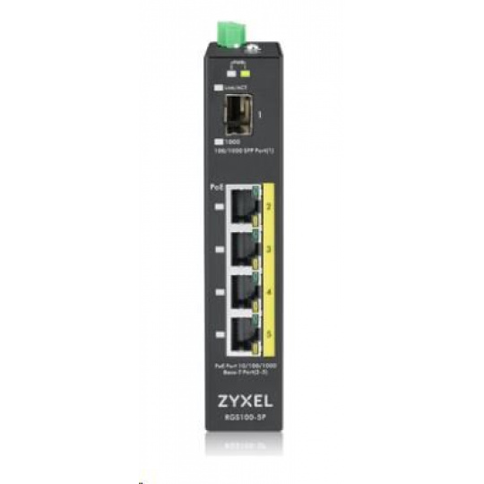 Zyxel RGS100-5P 5-portový gigabitový prepínač PoE, 4x GbE + 1x SFP, rozpočet PoE 120 W, montáž na DIN lištu/stenovú montáž, IP30